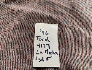 This material is called Lt Mocha. It was originally used in 94 Ford Escort. It is a really close match to the material that was used in F 150 and Broncos from the time period, so if you're in a pinch it Could work to sew in replacement panels on these vehicles as well.